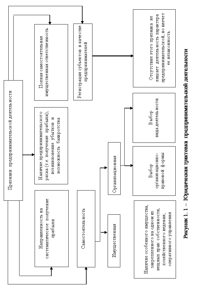 В современной экономической литературе сущность этого явления в большинстве случаев подменяется целью предпринимательской деятельности. Так, например, в «Большом экономическом словаре» под общей редакцией А.Н. Азрилияна дается следующее определение: «Предпринимательство – инициативная самостоятельная деятельность граждан, направленная на получение прибыли или личного дохода, осуществляемая от своего имени, под свою имущественную ответственность или от имени и под юридическую ответственность юридического лица»[16]. В учебниках предпринимательство определяется как непосредственная, самостоятельная, систематическая, на собственный риск деятельность по выполнению работ, оказанию услуг с целью получения прибыли, которая осуществляется физическими и юридическими лицами, зарегистрированными, как субъекты предпринимательской деятельности в порядке, установленном законодательством. Именно этот подход в России закреплен законодательно[17]. Согласно современному российскому законодательству под предпринимательской деятельностью понимается «самостоятельная, осуществляемая на свой риск деятельность, направленная на систематическое получение прибыли от пользования имуществом – продажи товаров, выполнения работ или оказания услуг, лицами, зарегистрированными в этом качестве в установленном законом порядке»[18] (Рисунок 1.1).