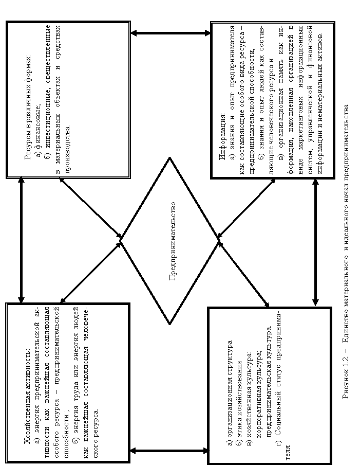 Синергетический подход, исходящий из открытости системы, акцентирует взаимосвязь предпринимателя и среды его деятельности и определяет предпринимательство как процесс самообновления и самоорганизации индивидуумов и предприятий, осуществляемый во взаимодействии с внешней и внутренней средой. Этот процесс преследует цель максимизации возможностей предпринимателя удовлетворять комплекс его социально-экономических потребностей (а не максимизация прибыли) в рамках неравновесного динамического баланса противоречивых социально-экономических интересов участников этого процесса – индивидуумов, организаций и общества в целом. Принципиальная особенность синергетического подхода к теории предпринимательства содержится в учете единства предметно- материального и идеально-творческого начал в предпринимательской деятельности[27] (Рис. 1.2).