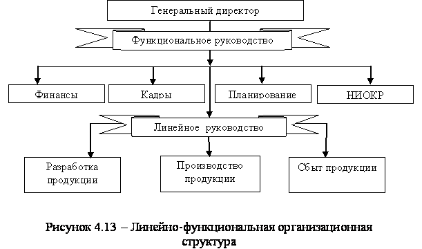 Далее следует рассмотреть организационные структуры с точки зрения взаимодействия подразделений. Наиболее традиционной является линейно-функциональная организационная структура. Основой здесь являются линейные подразделения, осуществляющие в организации основную работу, и обслуживающие их специализированные функциональные подразделения, создаваемые на «ресурсной» основе: кадры, финансы, план, сырье материалы и пр. (Рис. 4.13.)
