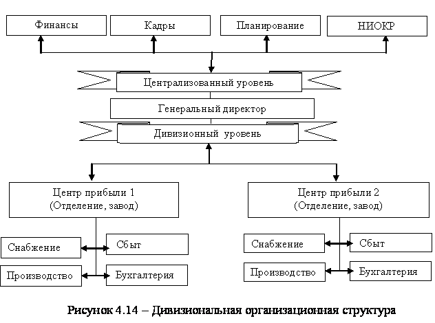 Подразделения были выделены в «центры прибыли» с правом принятия оперативных решений и ответственностью за получение прибыли. За высшим уровнем осталось централизованное планирование и распределение основных ресурсов. В общем виде дивизиональная структура вырастает из департаментизации, основанной на каком-либо конечном результате: продукте, потребителе или рынке. Переход на дивизиональную структуру позволяет организации продолжать рост и эффективно осуществлять управление разными видами деятельности и на разных рынках. Руководители отделений в рамках закрепленного за ними продукта или территории координируют деятельность не только по линии, но и по функциям, развивая тем самым в себе требуемые качества общего руководства. Таким образом, создается хороший кадровый резерв для стратегического уровня организации.