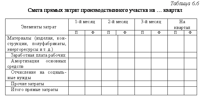 Смета прямых затрат производственного участка, цеха (Табл. 6.6) разрабатывается на квартал, но ежемесячно уточняется.