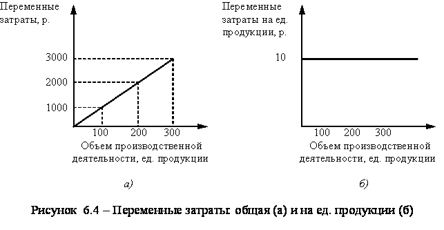 Таким образом, затраты, изменяющиеся пропорционально росту (снижению) объема производства, относятся к переменным затратам. Увеличение объемов производственной деятельности, например в два раза, вызовет увеличение переменных затрат также в два раза. Следовательно, переменные затраты имеют линейную зависимость от объема производства (Рис. 6.4а). Переменные же затраты, рассчитанные на единицу продукции, представляют собой постоянную величину. На Рис. 6.4б) показана динамика переменных затрат, где переменные затраты на единицу продукции условно остаются на уровне 10 тыс. р.