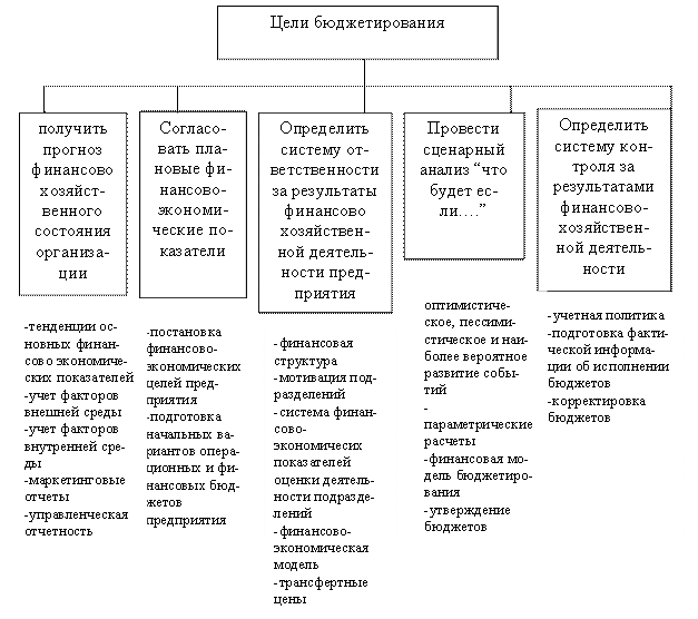 Бюджетирование – процесс планирования и контроля финансово-экономического состояния организации с распределением ответственности за результаты работы. Основные цели бюджетирования представлены на Рис.6.6.