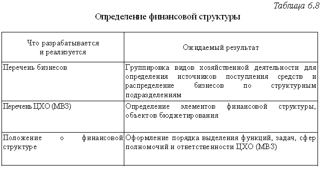 Прежде чем внедрять бюджетирование, компании необходимо создать финансовую структуру, которая может быть построена по иным принципам, нежели организационная структура. Некоторые подразделения могут быть объединены в единый финансовый центр ответственности. И наоборот, в рамках одного подразделения можно выделить разные центры ответственности (например, по видам продукции или направлениям деятельности).
