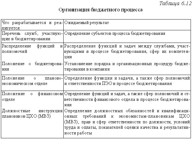- определяется, какие службы участвуют в бюджетировании (планово-экономический отдел, финансовый отдел, бухгалтерия и т. п.);