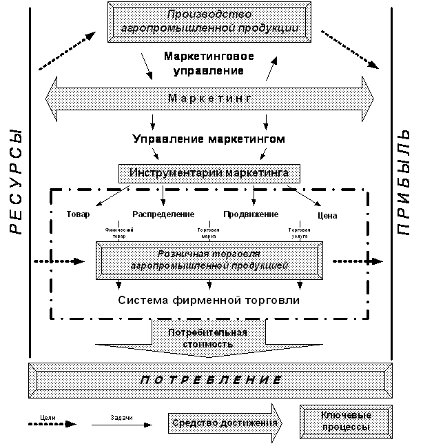 Фирменный продукт состоит из комплекса потребительных стоимостей физического товара, торговой услуги и торговой марки. В этой связи установлено, что фирменная торговля находится на стыке двух различных сфер приложения маркетинга: производственный маркетинг, или маркетинг материально-вещественных товаров (включает агромаркетинг), и маркетинг услуг. Следовательно, ее взаимосвязь с маркетингом проявляется в двух аспектах: во-первых, как часть общей системы маркетинговой деятельности агропромышленных предприятий, что указывает на вовлеченность фирменной торговли в единую цепь формирования добавленной стоимости продовольствия, а во-вторых, как обособленное звено, представляющее возможность выделить из процесса создания фирменного продукта конкретные, управляемые и поддающиеся регламентации операции и объекты розничной торговли, которые позволят производителям отраслей АПК повышать потребительную стоимость реализуемой в фирменной торговле агропромышленной продукции (рис. 2.2).