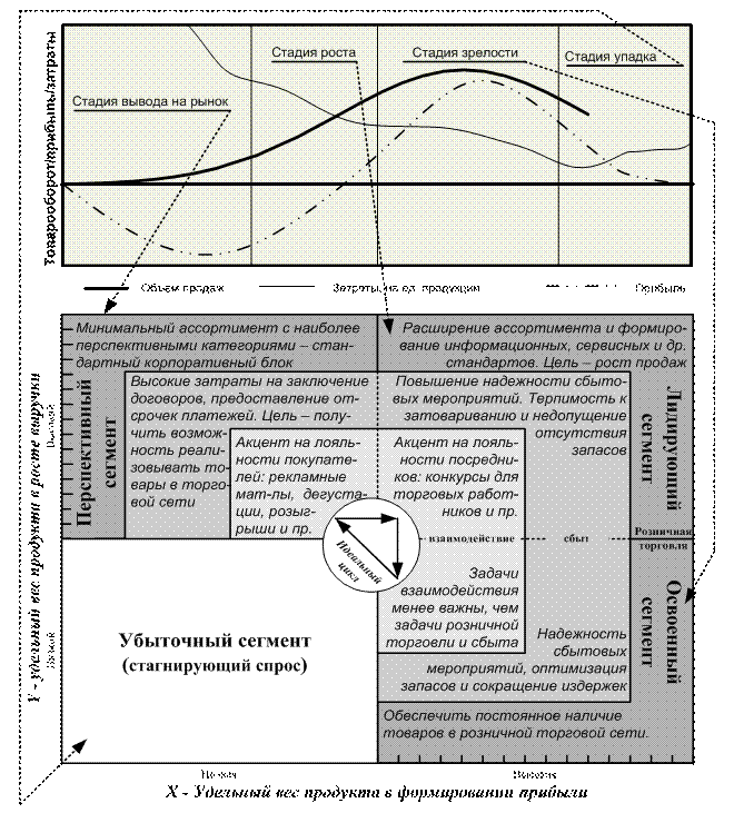 Таким образом, разработанный нами организационно-экономический механизм функционирования фирменной торговли предполагает согласование общих для всех ее субъектов задач деятельности, что позволяет учитывать как специфику фирменного продукта, так и стадии его жизненного цикла (ЖЦ). Применение эволюционного подхода при прогнозировании продаж дает возможность определить динамику движения фирменного продукта по фазам ЖЦ (становление, рост, зрелость, спад), в соответствии с которыми нами предложено осуществлять рациональное сокращение издержек по следующим ключевым параметрам фирменной торговой деятельности: