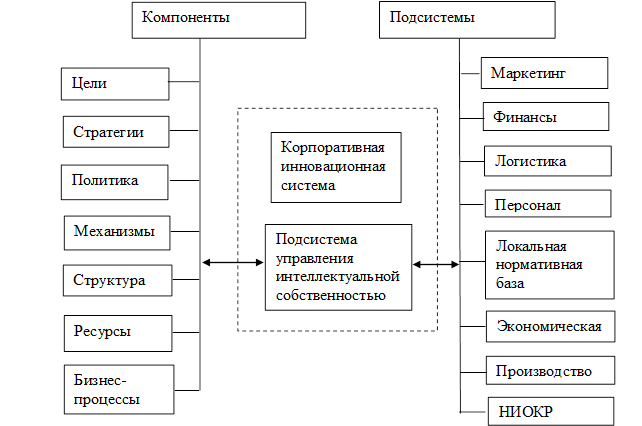Поэтому адекватной реакцией на возможные угрозы современности рынка инноваций может быть только система управления ИС с целенаправленной идеологией, отработанными механизмами, четкой структурой и формализованным процессом. Система управления ИС, предложенная Д. Шульгиным[68], представляет собой подсистему общекорпоративной системы управления, с учетом сложившихся организационной структуры и культуры (рис. 1.9.). В частности, поскольку отношения организации с авторами инноваций, как правило, выходят далеко за рамки патентного или авторского права, подсистема управления кадрами в организации должна включать в себя согласованные элементы управления интеллектуальной деятельностью персонала, а также правами на ее результаты. Кроме того, патентно-лицензионная деятельность требует затрат, а следовательно, она должна быть встроена в систему бюджетирования организации в рамках инновационных стратегий развития и финансовой политики.