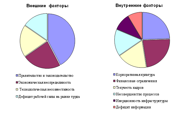 - Главными внутренними преградами на пути внедрения инноваций 35 % топ-менеджеров считают низкий уровень корпоративной культуры и неблагоприятный климат в компании; основными внешними препятствиями 32 % опрошенных называют различные правовые ограничения. (см. рис. 1.11).