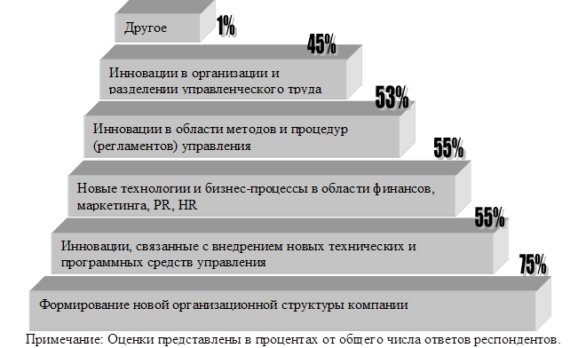 Менее распространенными оказались инновации в области регламентов управления (53%), и инновации в организации и разделении управленческого труда (45%).