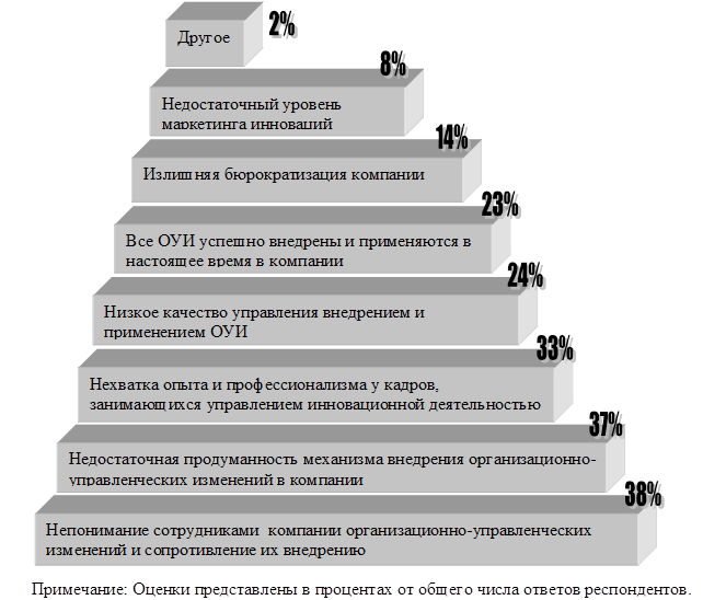 Главными внутренними преградами на пути внедрения инноваций 35% зарубежных топ-менеджеров считают низкий уровень корпоративной культуры и неблагоприятный климат в компании. Основными внешними препятствиями 32% опрошенных называют различные правовые ограничения. Менее значимыми являются прочие внешние факторы (экономическая неопределенность, технологическая несовместимость, дефицит на рынке труда). При этом треть опрошенных намерены справляться с этими препятствиями путем передачи генеральному директору ответственности за внедрение инноваций.