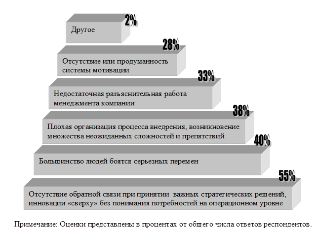 По данным исследования Ассоциации Менеджеров[117], графически отображенного на рис. 1.17, представители российского бизнес-сообщества отметили в качестве основных причин внутреннего сопротивления персонала организационно-управленческим инновациям отсутствие обратной связи при принятии важных стратегических решений (55%), боязнь перемен большинством людей (40%), а также плохую организацию процесса внедрения новшеств (38%) и недостаточную разъяснительную работу с персоналом (33%).