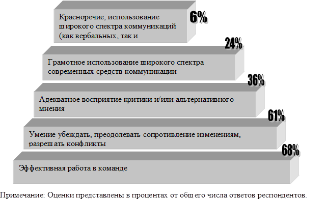 Основными коммуникационными компетенциями выступили способность эффективно работать в команде (68% ответов респондентов) и умение убеждать, преодолевать сопротивление изменениям, разрешать конфликты (61% ответов). Кроме того, к числу значимых коммуникационных навыков отнесены восприимчивость к критике, альтернативному мнению (36% опрошенных) и умение использовать эффективные средства коммуникации (24% респондентов).