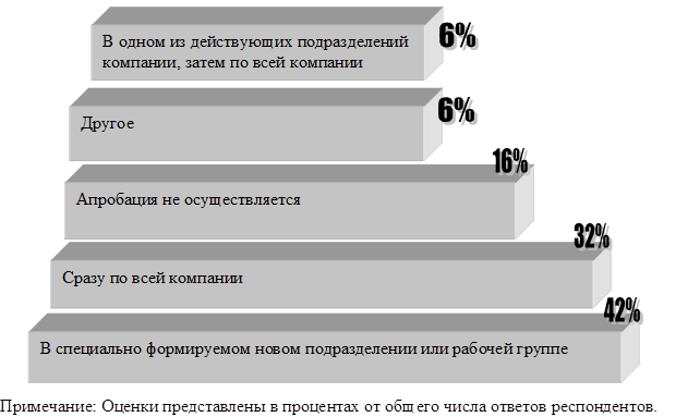 Апробация организационно-управленческой инновации в компаниях в специальной рабочей группе или в одном из действующих подразделений ведется в 42% организаций, принявших участие в исследовании Ассоциации Менеджеров.[127] Его результаты представлены на рис. 1.19. Апробация для всей компании используется в 32% случаев, в 16% случаев апробация не осуществляется вовсе.