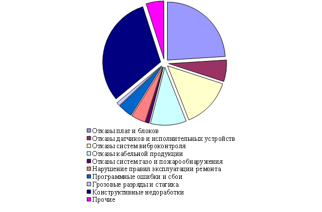 Процентное распределениеосновных причин отказов из года в год остается практически неизменным. В основном это неисправности систем КИПиА — 49 %, неисправности систем смазки, уплотнения, регулирования — 19 % и разрушения узлов и деталей — 20 %. Рост доли отказов по причинам КИПиА объясняется тем, что эти сбои, а именно так трактует подобный отказ теория надежности, ранее не учитывались. Анализ структуры отказов по типам ГПА указывает, что это распределение справедливо для всех типов ГПА. Исключение составляют агрегаты первого поколения ГТ-750-6 (0) отказов КИП, ГТ-6-750 25 % отказов КИП и ГТН-25-76, имеющие 15 % отказов КИП. Процент аварийных и вынужденных остановок по причинам КИП увеличивается по мере роста уровня автоматизации ГПА и достигает 80 и даже 100 % на современных типах ГПА.