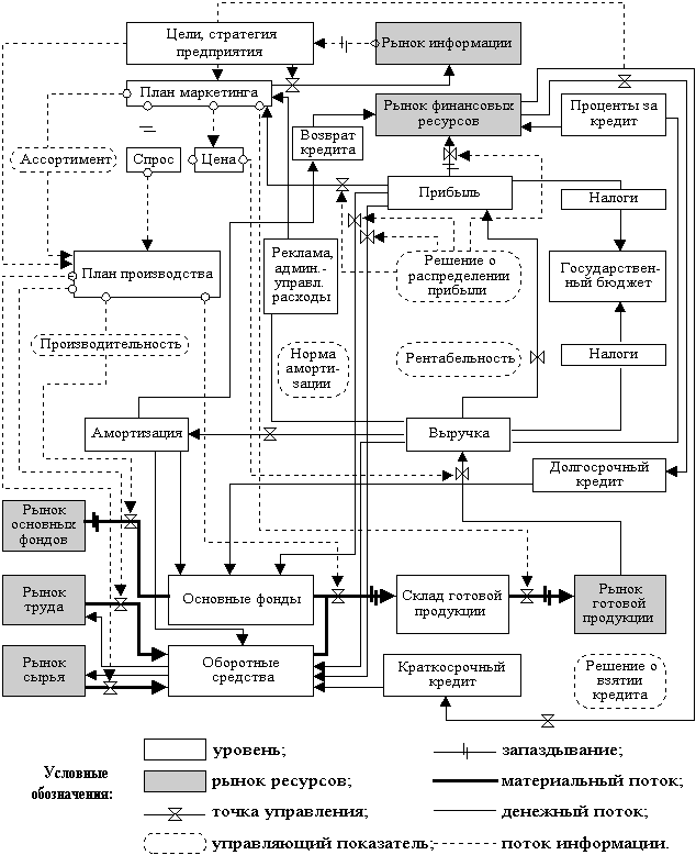 Характерно, что на первое место поставлены упрощение или удаление. Если понимать под бизнес-процессом “логические серии взаимосвязанных действий, которые используют ресурсы предприятия для создания или получения в обозримом или измеримо предсказуемом будущем полезного для заказчика выхода” (продукты или услуги) [38], то становится очевидной сложность проблемы моделирования (а иначе нечего говорить об автоматизации) сотен динамичных производственных процессов, во многом нестационарных. Подробно эта проблема будет рассмотрена ниже. Для иллюстрации ее сложности на рис. 15 приводится взятая из [66] структура динамической модели промышленного предприятия.