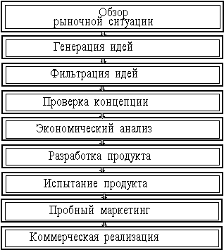 Схема процесса разработки и вывода товара на рынок включает этапы от генерации идей до начала коммерческой реализации товара. В это время фирма создает потенциальные варианты, получает представление потребителей о них, оценивает их, устраняет наименее привлекательные, разрабатывает опытные образцы продукции, испытывает их и внедряет на рынке. Экономия на первых этапах может вызвать большие издержки и даже потери на последующих. Поэтому разумная политика состоит в тщательной проверке концепции товара на ранних этапах. Основные этапы этого процесса отражены на рис. 23.