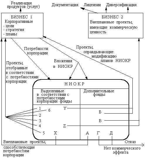 Бизнес 1 предполагает выделение ресурсов на НИОКР, большая часть которых расходуется на выполнение проектов, непосредственно связанных с реализацией стратегии корпорации (проекты 1–6). Часть средств выделяется на усмотрение руководителя НИОКР и используется для финансирования индивидуальных или неясных по результатам исследований. Проекты X, Y, Z - расширение формальной программы НИОКР или новые неожиданные возможности, появившиеся в ходе выполнения основной программы. Проекты А-Д возникают как результат исследований по дополнительным фондам.