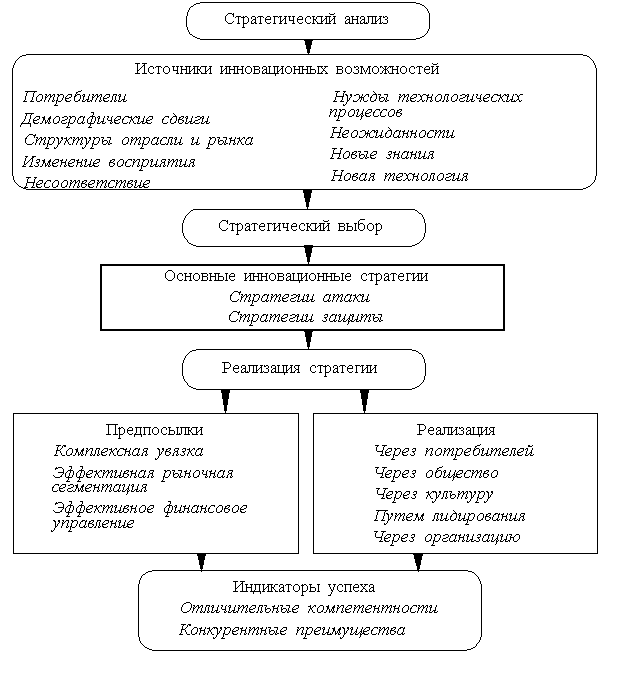 Как известно [20, 94, 108], идентификация или определение стратегии - лишь начальный этап стратегического менеджмента. В целом стратегический менеджмент инноваций может быть представлен схемой на рис. 26 [60].