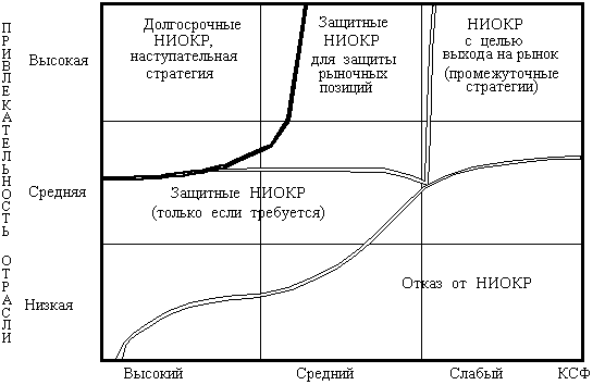 4. Фирма в своей деятельности может использовать наступательную стратегию НИОКР (разработка новых продуктов и технологий), защитную стратегию (улучшение продуктов и технологий), смешанную стратегию, а также лицензирование. Выбор стратегии зависит от рыночного положения фирмы, ее конкурентного статуса, стадии жизненного цикла отрасли и характера портфеля СЗХ (для диверсифицированной фирмы).