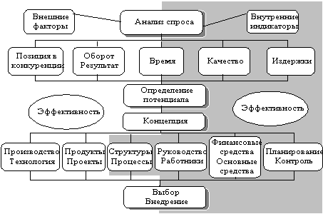 – организационных (концепция, выбор, планирование, контроль, кадры, структуры,