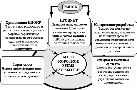 Рис. 31 иллюстрирует кругооборот целей и задач (“круговую зависимость”) рыночной деятельности, политики НИОКР, конкретных разработок и портфеля продуктов фирмы. Следует обратить внимание на то, что на рис. 30 и 31 присутствует в качестве важнейшего фактора время. Фактор времени, безусловно, один из важнейших для успешности реализации результатов НИОКР (рис. 32). Чтобы сократить время разработки, фирме целесообразно провести контроллинг своей деятельности в области НИОКР и запланировать, а также реализовать мероприятия, приведенные на рис. 33. Следует еще раз подчеркнуть, что нельзя рассматривать сферу НИОКР в фирме как независящую от других. Только комплексное взаимодействие и совершенствование всех сфер деятельности фирмы может обеспечить успех ее инновационной деятельности.