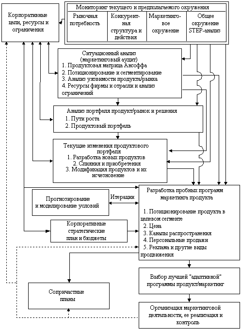 В заключение раздела приводим схему [97] маркетинговой деятельности фирмы (см. рис. 37), в которой четко показаны связи параметров стратегического менеджмента (корпоративные цели, ресурсы, ограничения, ситуационный анализ, анализ портфеля), маркетингового сканирования (мониторинг текущего и предполагаемого окружения, ситуационный анализ) и НИОКР (текущие изменения продуктового портфеля).