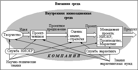 Рис. 52. Инновация как результат взаимодействия сфер НИОКР маркетинга, производства, управления