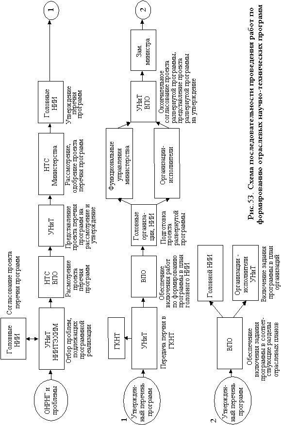 1. Приступая к работам по формированию и реализации программ, необходимо четко представлять организационную схему, последовательность и функции организаций, участвующих в этой работе, которая должна органически вписываться в действующую схему управления научно-технической деятельности. Предполагается общая схема последовательности проведения работ по формированию отраслевых научно-технических программ [49]. На рис. 53 предложена схема такого формирования для одного из промышленных министерств.