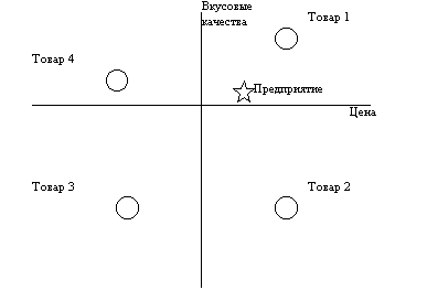 Затем свойства планируемой или производимой продукции переносятся на диаграмму. Тем самым становится ясным, как будет восприниматься планируемая к освоению продукция на рынке вообще или в каждой группе Потребителей. А так же с какой из представленных на рынке видов продукции она войдет в непосредственное конкурентное противодействие.