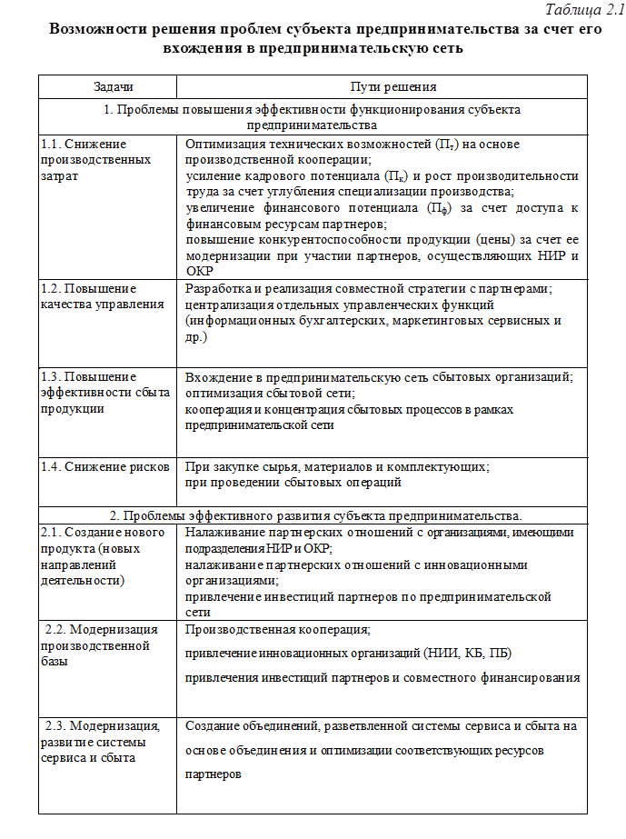 Возможности решения проблем субъектов предпринимательской деятельности за счет вхождения в предпринимательскую сеть представлены в табл. 2.1.