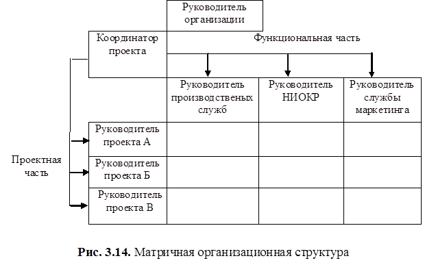 Впервые матричные структуры (рис. 3.14) возникли в компьютерном производстве в компании IBM. Переход к матричной структуре явился реакцией на изменение глубины и силы воздействия ряда факторов внешней среды: интенсификации потоков информации, ограничение финансовых и людских ресурсов, предъявление высоких требований одновременно и к функциональному, и продуктовому направлению. Отсюда система двойного подчинения, когда у одного работника одновременно два начальника – функциональный и продуктовый. Соответственно матрица отношений состоит из трех типов ролей: