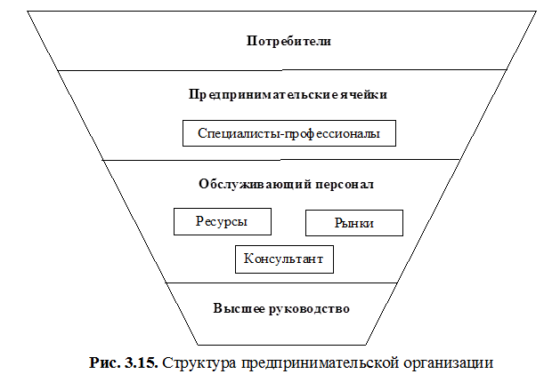 В случае, если деятельность конкретных специалистов-исполнителей или их групп, обслуживающих потребности рынка, перестает нуждаться в координировании руководством сверху, организационную структуру следует строить по предпринимательскому типу. Графически организационная структура будет выглядеть (рис. 3.15) как перевернутая пирамида, на верхний уровень которой выведены специалисты-профессионалы, а в основании находится руководство организации.