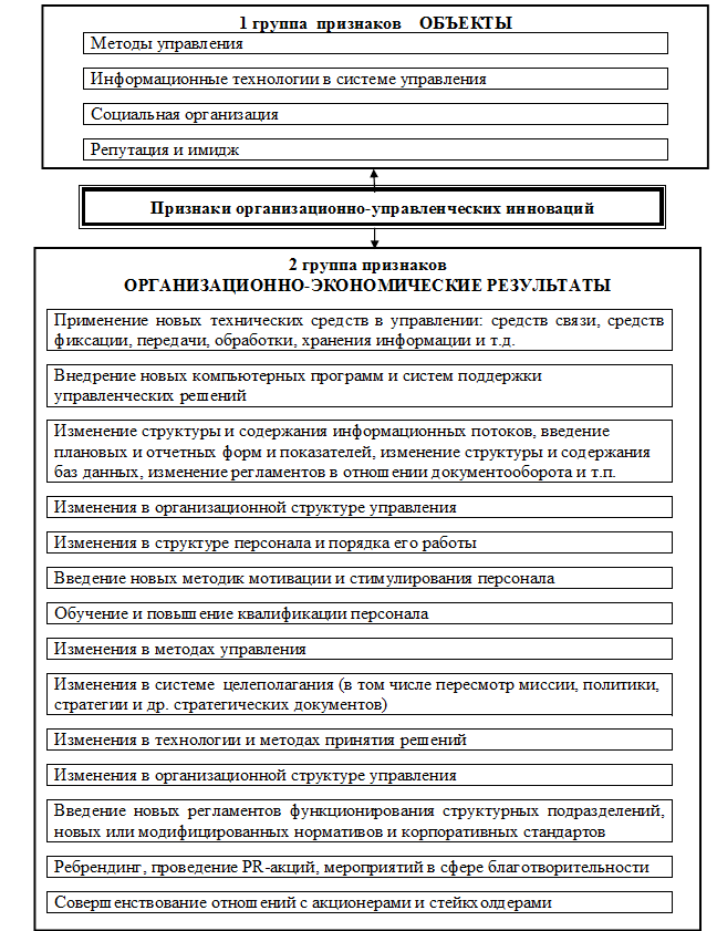 Организационно-управленческие инновации – это изменения в системе управления предпринимательской структурой с целью повышения эффективности ее функционирования и конкурентоспособности. Признаки отнесения инноваций к организационно-управленческим можно разделить на две группы (рис. 4.5).