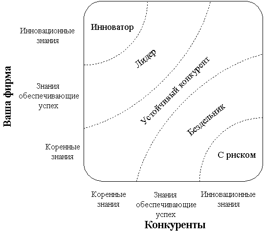 Знания, обеспечивающие успех, снабжают фирму конкурентным потенциалом. Фирма может иметь в общем тот же самый уровень, кругозор или качество знаний как и ее конкуренты, хотя специфические знания могут помочь ей использовать стратегию дифференциации /4/. Эти фирмы могут выбрать конкуренцию по знаниям в сходной конкурентной позиции, надеясь, что они знают больше конкурентов.