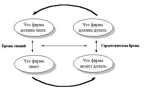 Имея усовершенствованную стратегическую эволюцию ресурсов и способностей на основе знаний, организация может определить какие знания следует разработать или получить. Чтобы учесть стратегический аспект менеджмента знаний, управление знаниями в фирме должно быть прямо ориентировано на закрытие стратегических брешей. Важный вывод состоит в том, что брешь знаний прямо вытекает из и согласуется со стратегической брешью (рис. 4). Это непрерывное согласование стратегии и знаний представляет собой критический момент фирменной стратегии знаний. Во многих фирмах эффективность управления знаниями зависит от степени разрыва между стратегическим планированием и практикой.
