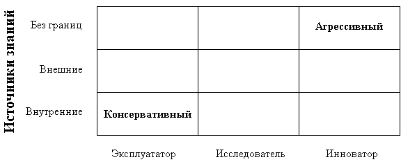Фирмы, ориентированные на эксплуатацию внутреннего знания, исповедуют наиболее консервативную стратегию знаний, в то время как те, кто полно интегрирует исследования знаний и их эксплуатацию вне зависимости от текущих задач и рамок организации (безграничные инноваторы) представляют пример наиболее агрессивной стратегии знаний. В наукоемких отраслях последние обычно превосходят конкурентов, придерживающихся более консервативной стратегии. Агрессивная стратегия обычно требуется и при отставании фирмы в конкурентной борьбе.