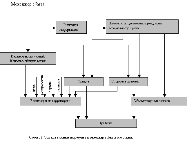Рассмотрим схему влияния на финансовый результат менеджера по сбыту, имеющего полномочия варьировать скидки и условия платежа (сх. 21):