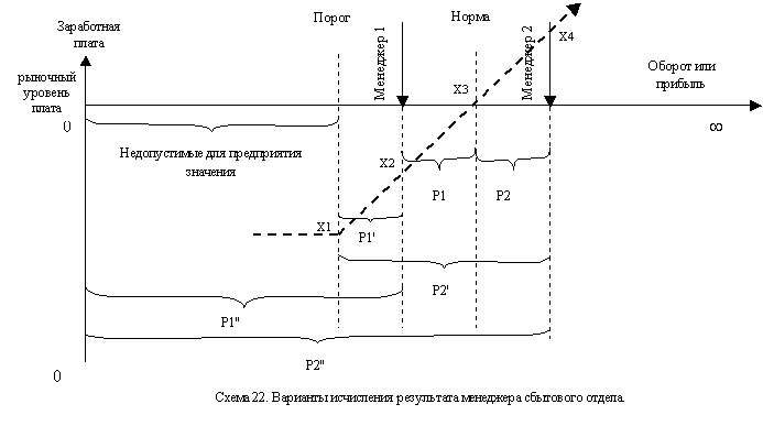 На схеме 22 представлено несколько способов вычисления результата. Вне зависимости от градуировки шкалы в цифрах оборота или прибыли, на ней можно выделить участок недопустимых значений (уровень эффективности, который предприятие не должно себе позволять) и нормативную величину. Результат Р1 менеджера 1 вычисляется с обратным знаком от нормы, становится положительным при вычислении от порогового значения (Р1') и достигает максимума при сравнении с нулем (Р1''). Результат менеджера 2 остается положительным при любой точке отсчета.