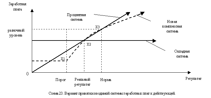 Если коррекция производится относительно беспроблемным предприятием, например, в целях совершенствования управления, и заработные платы сотрудников приблизительно соответствуют рыночному уровню (необходимо изменить их структуру и привязку к результату), то расчет может строиться по трем основным точкам (сх. 23):