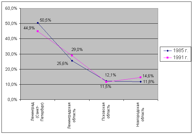 Территориальные структуры рынков Северо-Запада России в 1985 и 1991 гг. представлены на рис. 1.2. Как видно из рисунка, основным структурным сдвигом явилось перемещение псковского сектора на четвертое место с падением его доли с 12,15 до 11,5%. Место псковского сектора в комплексе заняла Новгородская область, увеличив свою долю с 11,8% в 1980 г. до 14,6% в 1991 г. Санкт-Петербург сохранил доминирующее положение, хотя его удельный вес понизился с 50,5% до 44,9%. Ощутимо, возросла доля Ленинградской области. Однако в целом территориальные сдвиги в структуре СЗСК за более чем десятилетний период следует считать незначительными.