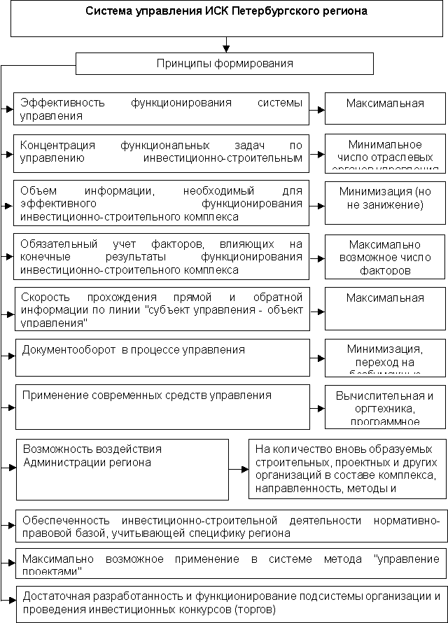 Анализ системы распределения предметов ведения между отраслевыми органами управления в структуре Администрации Санкт-Петербурга, занятыми в инвестиционно-строительной сфере (предметы ведения некоторых комитетов представлены в табл. 1.6 [47]), могут помочь сформулировать определенные принципы формирования системы управления ИСК региона (рис. 1.4) и дать некоторые рекомендации по повышению эффективности функционирования такой системы.