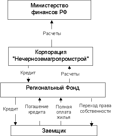 Кроме вышеперечисленных схем, возможен порядок финансирования жилищного строительства с использованием региональной некоммерческой организации (Фонда). В этой связи широко известна модель г. Сарова с участием Фонда социального развития, которая уже достаточно освещена в печати. Поэтому мы рассмотрим другую схему, разработанную корпорацией "Нечерноземагропромстрой".