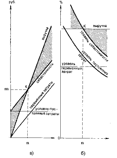 Зависимость прибыли от реализации выражается с помощью графика рентабельности (рис. 2), где точка К является точкой безубыточности. Она показывает ту предельную сумму выручки от реализации продукции в стоимостной оценке (оm) и в натуральных единицах измерения (оn), ниже которой деятельность хозяйствующего субъекта будет убыточной, так как линия себестоимости выше линии выручки от реализации продукции. Графики рентабельности представляют очень простой и эффективный метод, позволяющий подойти к решению таких сложных проблем, как-то: что случится с прибылью, если выпуск продукции уменьшится: что случится с прибылью, если цена будет увеличена, себестоимость снижена, а реализация упадет? Главная задача построения графика рентабельности заключается в определении точки безубыточности — точки, для которой полученная выручка равна денежным расходам.