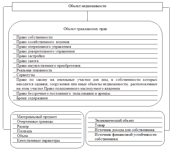 Сущность объектов недвижимости заключается в триединстве категорий: материальная (физическая), правовая и экономическая (рис. 1.5).