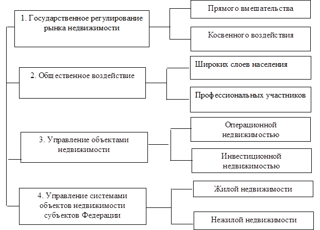 Государственное регулирование недвижимости: путем прямого вмешательства (прямое административное управление), включающего: создание законов, постановлений, правил, инструкций и положений, регулирующих функционирование объектов недвижимости; введение механизма ответственности за нарушение нормативных требований при совершении сделок с объектами недвижимости; контроль за соблюдением всеми субъектами рынка установленных норм и правил; регистрацию прав на объекты недвижимости и сделок с ними; лицензирование предпринимательской деятельности в сфере недвижимости;
