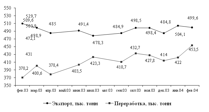Рис. 4.4 Среднесуточная первичная переработка нефти на нефтеперерабатывающих заводах РФ и среднесуточный экспорт нефти из РФ 2003-2004 гг., тыс. тонн