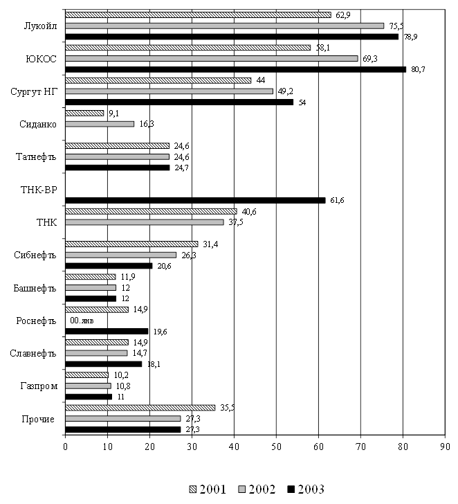 Рис. 4.5 Добыча нефти российскими компаниями в 2001-2003 гг., млн. т.