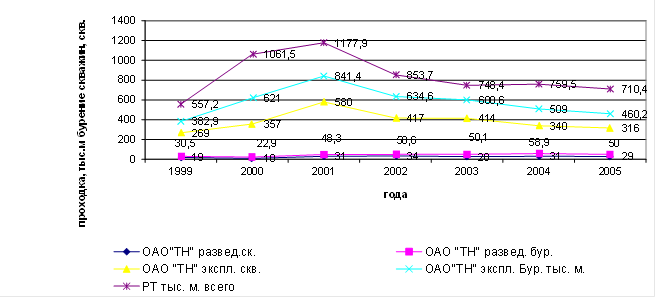Объем эксплуатационного бурения на месторождениях ОАО «Татнефть» в 2004 г. составил 509 тыс. м, или 340 скважин (Рис. 4.14). Разведочное бурение в 2004 г. составило 58,9 тыс. м, при этом введено 359 новых скважин, в том числе из бурения – 311, из освоения и бурения прошлых лет – 48 скважин. Средний дебит нефти новых скважин составил – 6,6 т/сут., при ожидаемой – 6,5 т/сут. Ожидаемый ввод скважин – 289 скважин.
