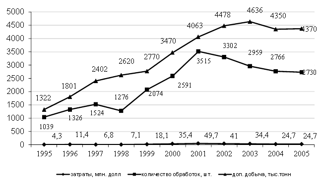 На 2005 год прогноз добычи нефти по ОАО «Татнефть» составит 25110 тыс. тонн при проектном 23566 тыс. тонн. Объем и эффективность ГМТ представлены в Таблице 4.6